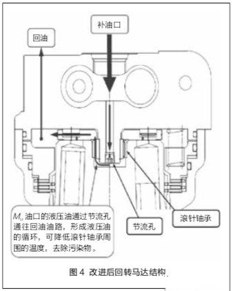 我們在回轉(zhuǎn)馬達(dá)滾針軸承上新增加補油口,并通過單向閥與液壓油箱連接,單向閥開啟壓力即為補油口背壓,一般為0.5MPa。補油口是為回轉(zhuǎn)馬達(dá)停止時釋放壓力與消除氣穴設(shè)置的油口,可為回轉(zhuǎn)馬達(dá)補充液壓油及釋放壓力。為了改進(jìn)滾針軸承潤滑不良的狀況,我們在回轉(zhuǎn)馬達(dá)殼體上增加了節(jié)流孔,形成補油口-節(jié)流孔-回油口的油道。由于補油口具有一定的背壓,因此補油口的液壓油可通過節(jié)流孔通往回油油路,形成液壓油流經(jīng)滾針軸承的循環(huán),由此對滾針軸承進(jìn)行潤滑、降溫、去除污染物,增強(qiáng)其潤滑后,可減少其疲勞磨損、提高其使用壽命。改進(jìn)后回轉(zhuǎn)馬達(dá)結(jié)構(gòu)如圖4所示。