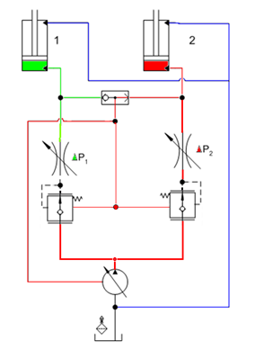 1:系統(tǒng)可以提供飽合流量,用前置式壓力補(bǔ)償,不論回路的負(fù)載壓力如何變化或其他回路的負(fù)載壓力變化,回路的控制流量不變,如下圖;